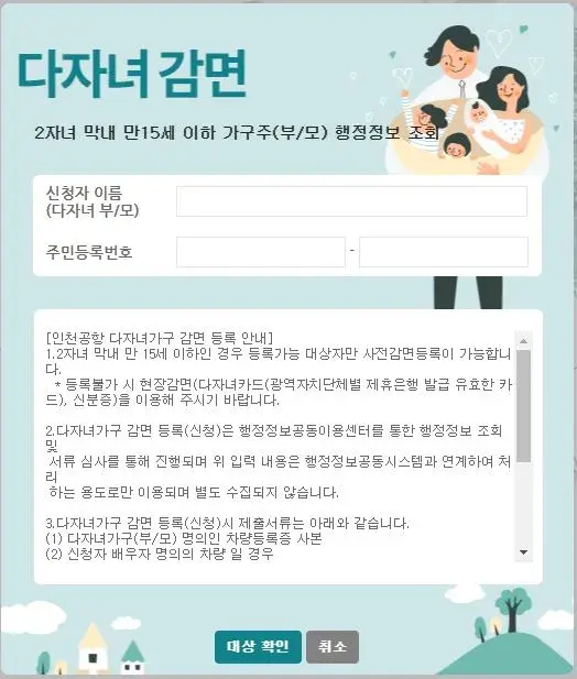 • 다자녀 할인 대상 : 한국 국적이며 2자녀 이상, 막내 만 15세 이하 가구 신청 가능