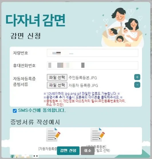 5.할인 대상인 분들은 차량번호와 휴대폰 번호를 작성해주시고 , 주민등록등본과 자동차 등록증을 올리면 됩니다.