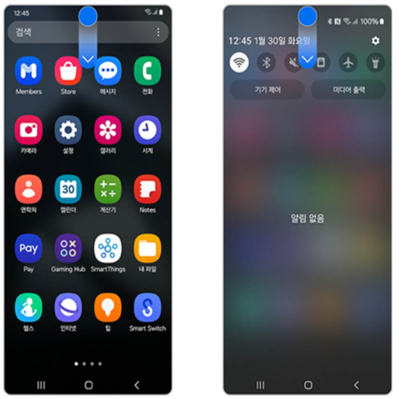 1. 화면을 아래로 내린 후 한번더 내리면 퀵패널 확장 창이 나타납니다.