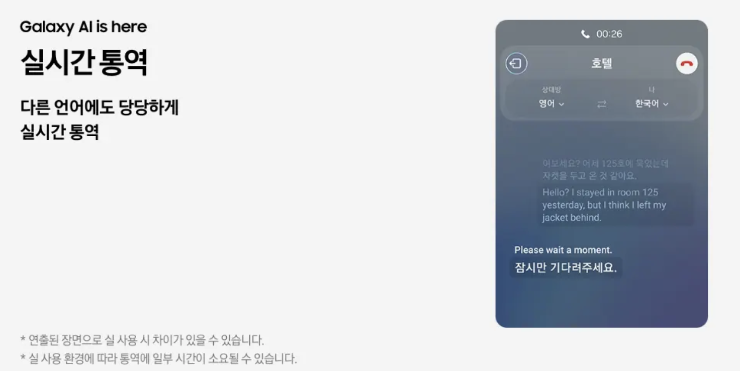 AI기능이 강화된 삼성 갤럭시 s24 시리즈에는 통역 앱을 제고합니다.