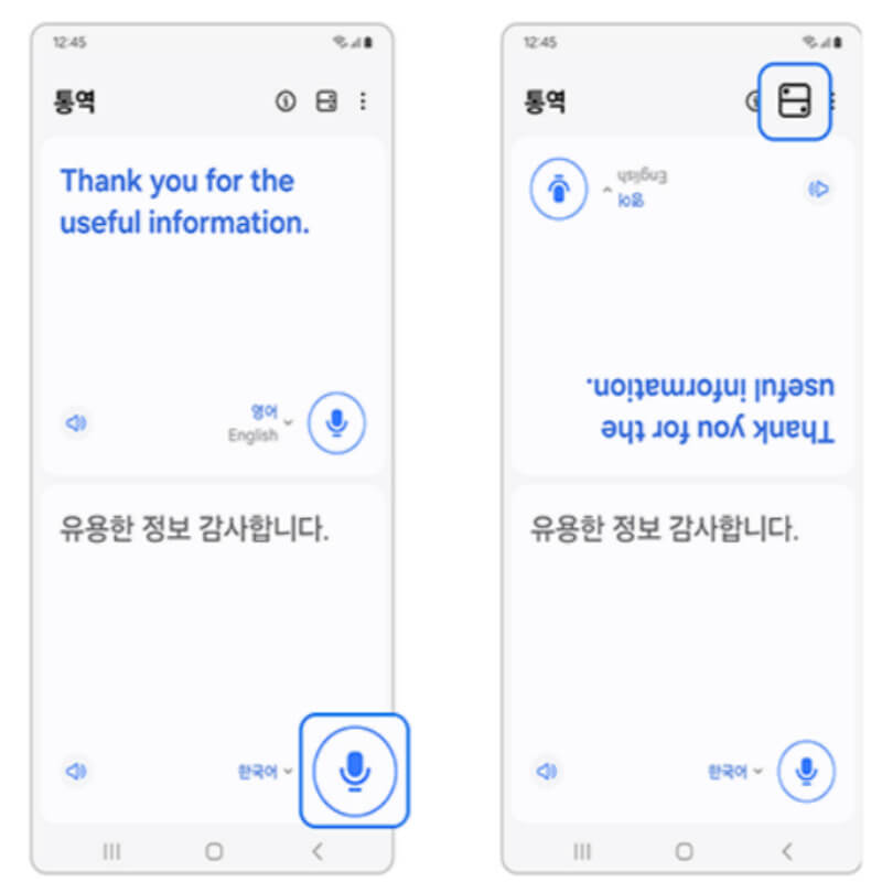 4. 보기모드 변경하여 상단 화면의 반이 상대방에게 향하도록 뒤집여지고, 상대방과 편하게 대화를 주고받을 수 있습니다. AI알고리즘 특성 상 동일한 표현이지만 번역 결괏값은 달라질 수 있습니다.