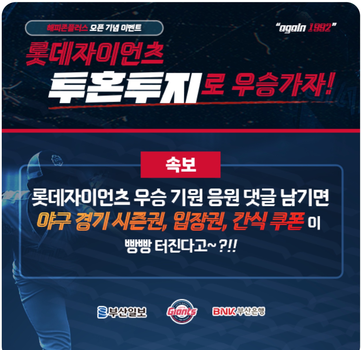 이번 이벤트를 기념해 롯데자이언츠의 우승을 기원하는 댓글 응원전을 롯데자이언츠 야구단, BNK부산은행과 같이 진행을 합니다.