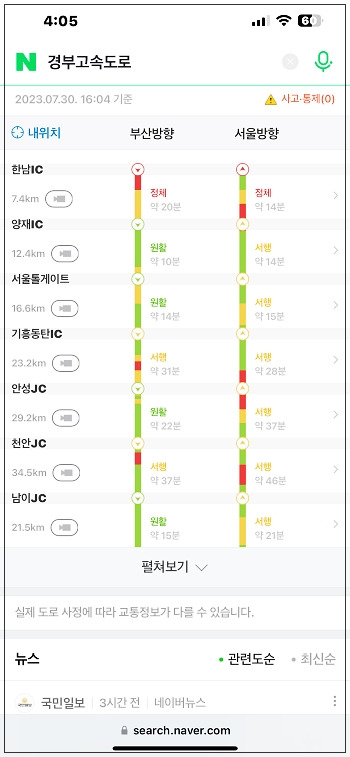 네이버 검색을 통해 경부고속도로의 교통상황을 확인하면 각 구간별 소통 현황이나 정체 구간 정도는 알 수 있습니다.