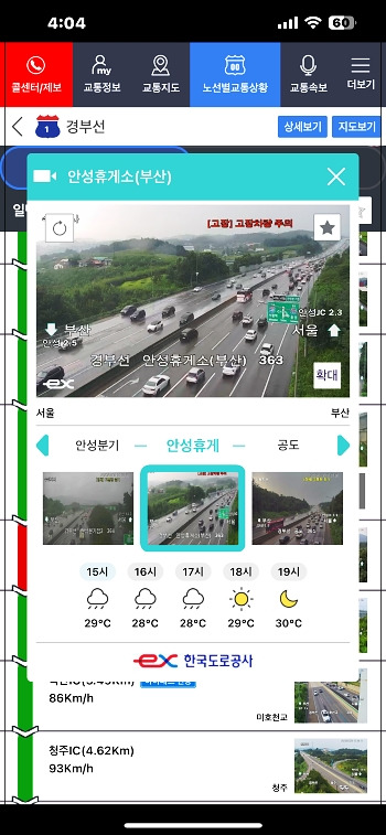 • 구간별 교통상황 확인: 서울~부산 구간의 양방향 상황 확인 가능