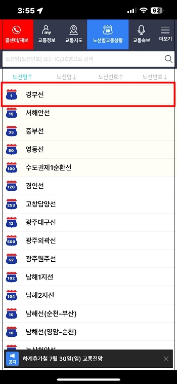 설치 후 앱을 열고 "노선명"에서 경부선을 선택합니다.