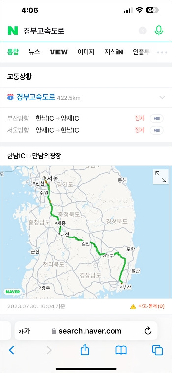 네이버 검색을 통해 경부고속도로의 교통상황을 확인하면 각 구간별 소통 현황이나 정체 구간 정도는 알 수 있습니다.