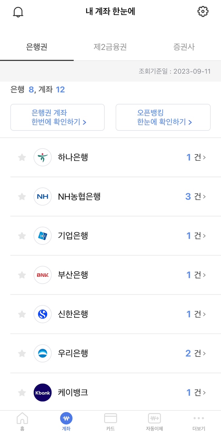 어떤 곳에 계좌가 있는지, 2 금융권, 증권사 등 모든 금융기관 계좌조회가 가능했습니다.