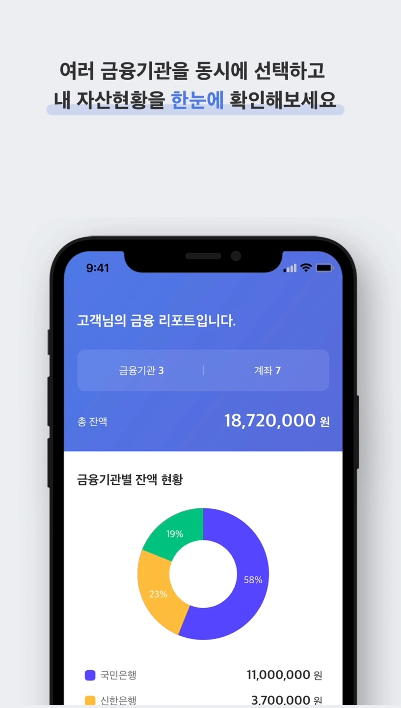 내가 가지고 있는 금융기관의 정보를 조회를 할 때 각 금융기관에 접속 또는 어플을 다운로드해서 조회를 해야 하는 번거로움이 있습니다.