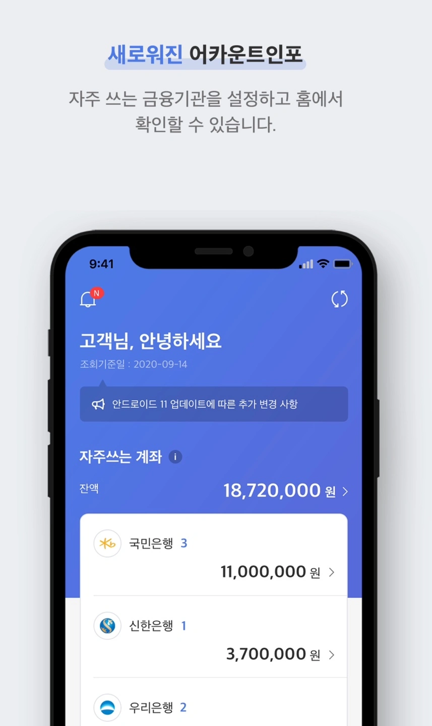 하지만 어카운트인포(페이인포)를 통해서 한눈에 쉽에 모든 금융정보를 확인할 수 있게 되었습니다.
