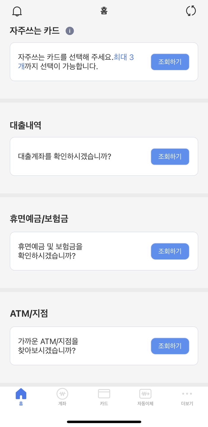 왼쪽의 화면에서 아래로 화면을 내려가면 자주 쓰는 카드/ 대출내역/ 휴면예금, 보험금 등 조회하기가 보입니다.
